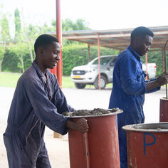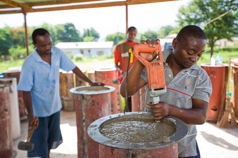 Source water is poured into the top of the filter, through a diffuser to protect the surface of the sand and travels through the sand layer, the small gravel layer, the large gravel layer and up the plastic tubing encased in the concrete and out of the filter, for the user to collect in a clean water container.