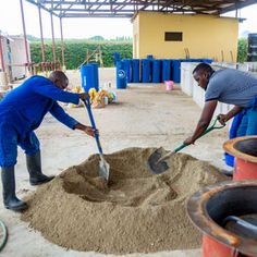 A concrete container about 1 meter in height and roughly 1/3 meter in diameter, which holds layers of sand and gravel.